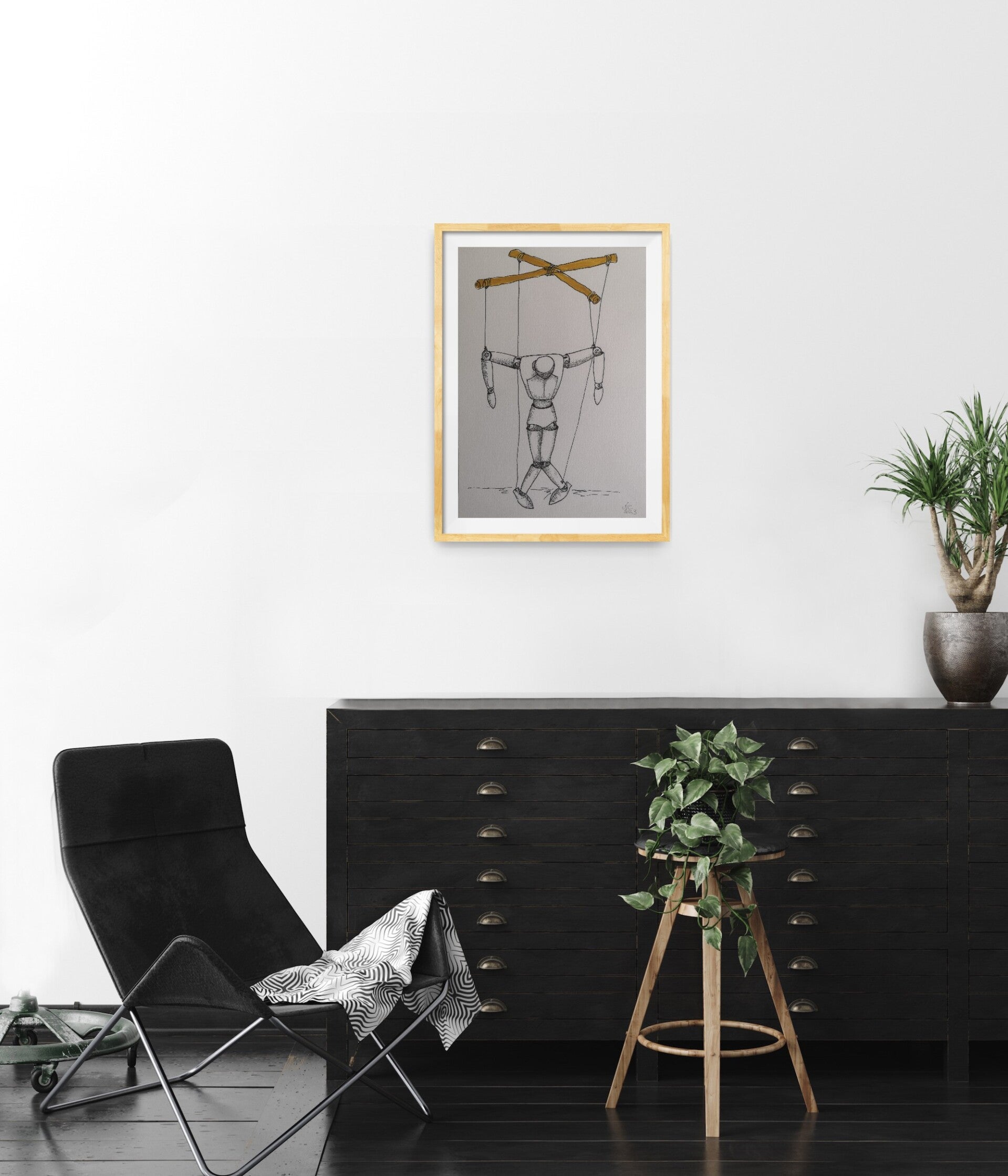 The strings that dominate the wooden figure symbolize the invisible forces that guide our actions and force us into roles we may not have chosen for ourselves. The golden rods to which the strings are attached add a layer of irony—the splendor and shine of power that often pulls the strings, masking the darkness of manipulation.