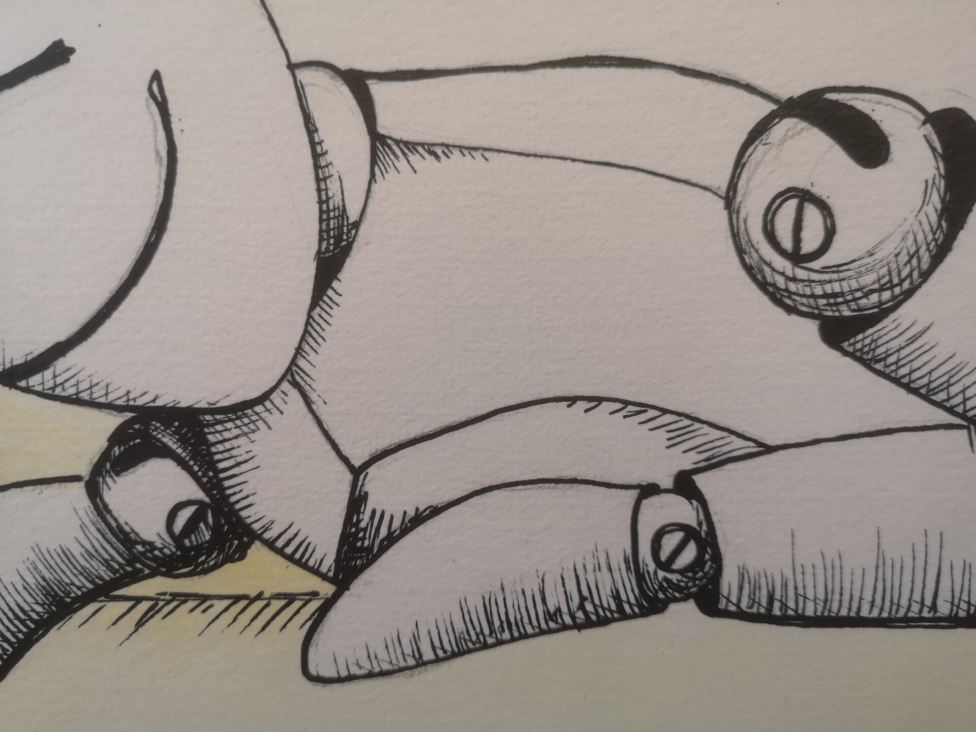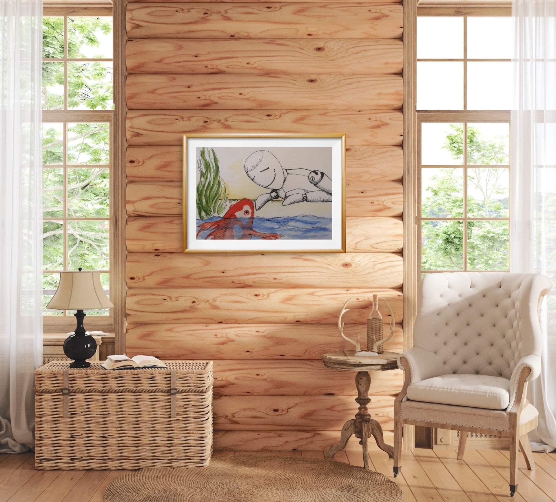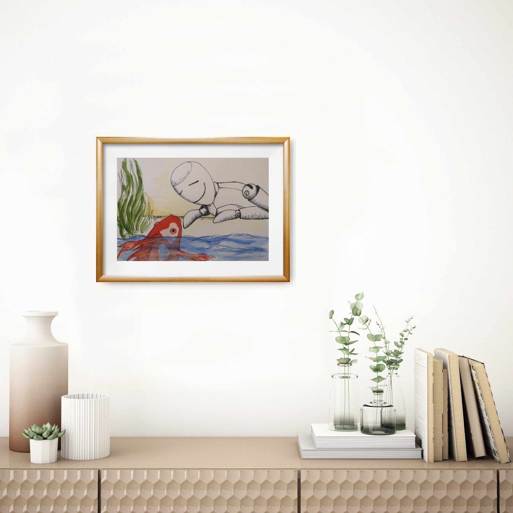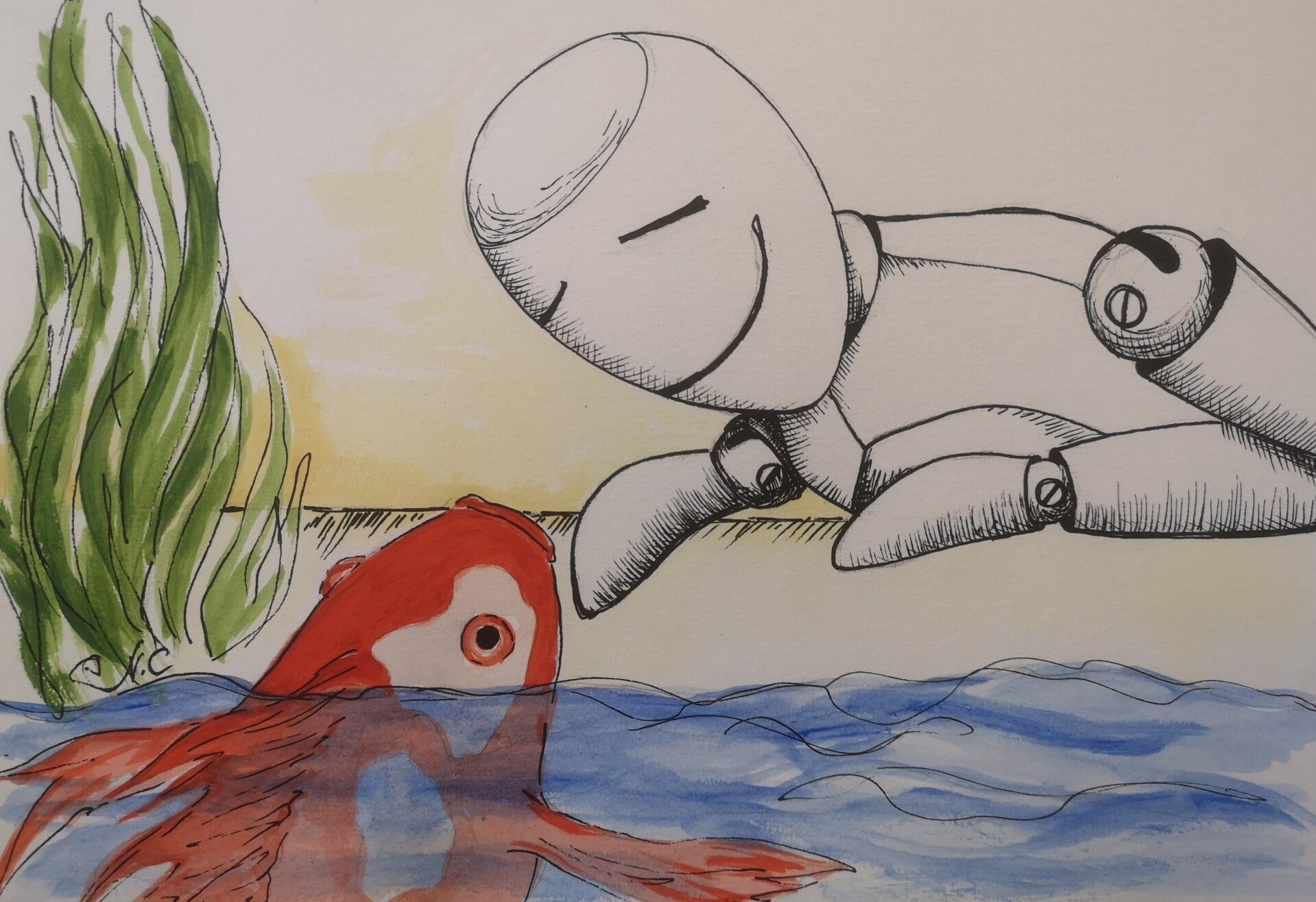 In this graceful artwork, created with acrylic on paper, a scene of harmony and quiet communication between beings is captured. In the foreground, a wooden figure, sketched with a black acrylic pen, stands facing a red fish peeking curiously out of the water. A satisfied smile graces the figure's face, as if a silent, invisible dialogue has been established between it and the fish.