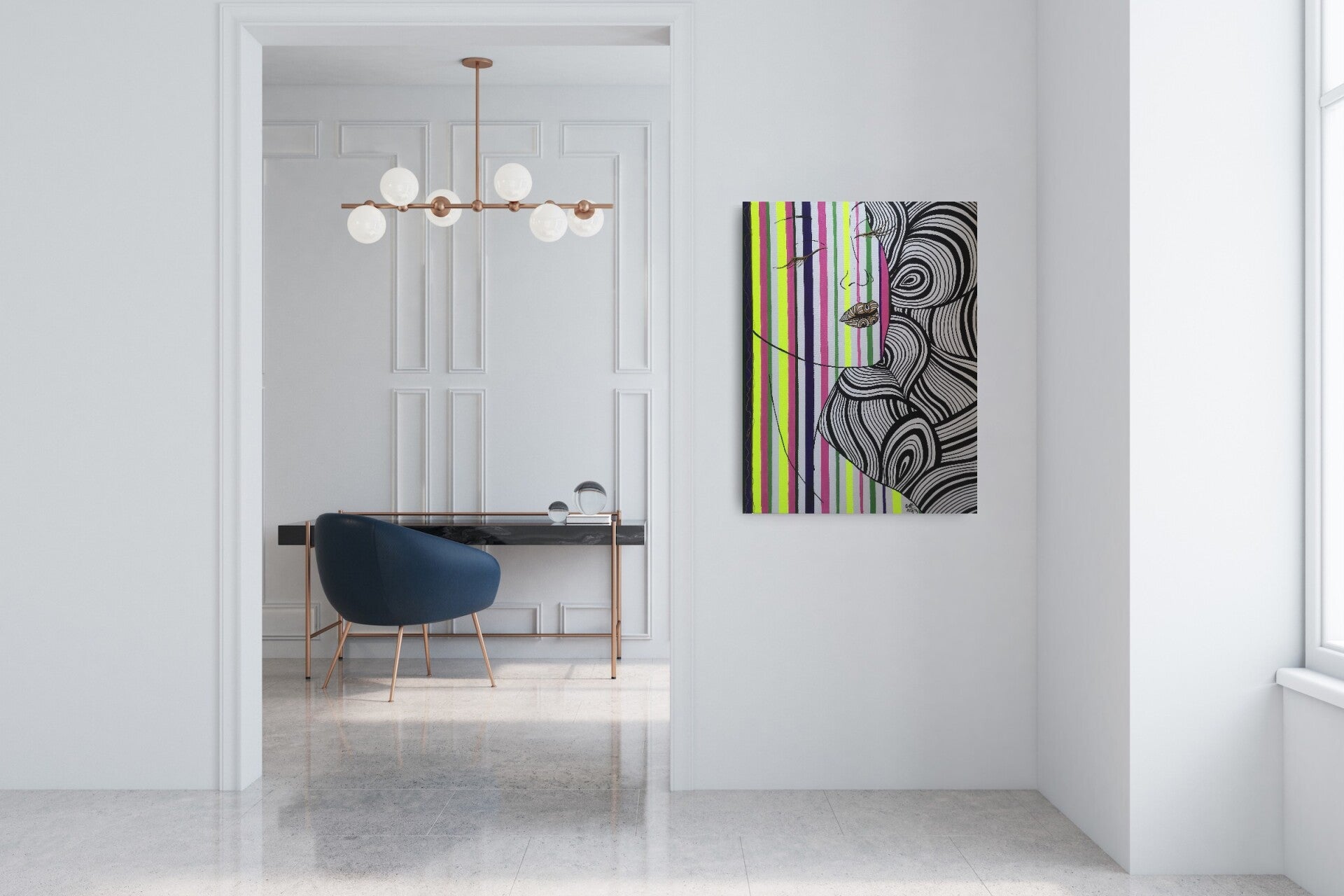 This artwork is a tribute to the power of silence and self-reflection. It challenges us to look beyond the outer appearance and recognize the depth of emotions and thoughts that lie beneath the surface. The woman, caught in a moment of quietude, surrounded by the dynamic energy of colors and the echo of bygone times through the retro pattern, embodies the connection between past and present, between external beauty and inner depth. In its entirety, this work is not just a visual narrative but also a mirror inviting us to reflect on the complexity of our own being.