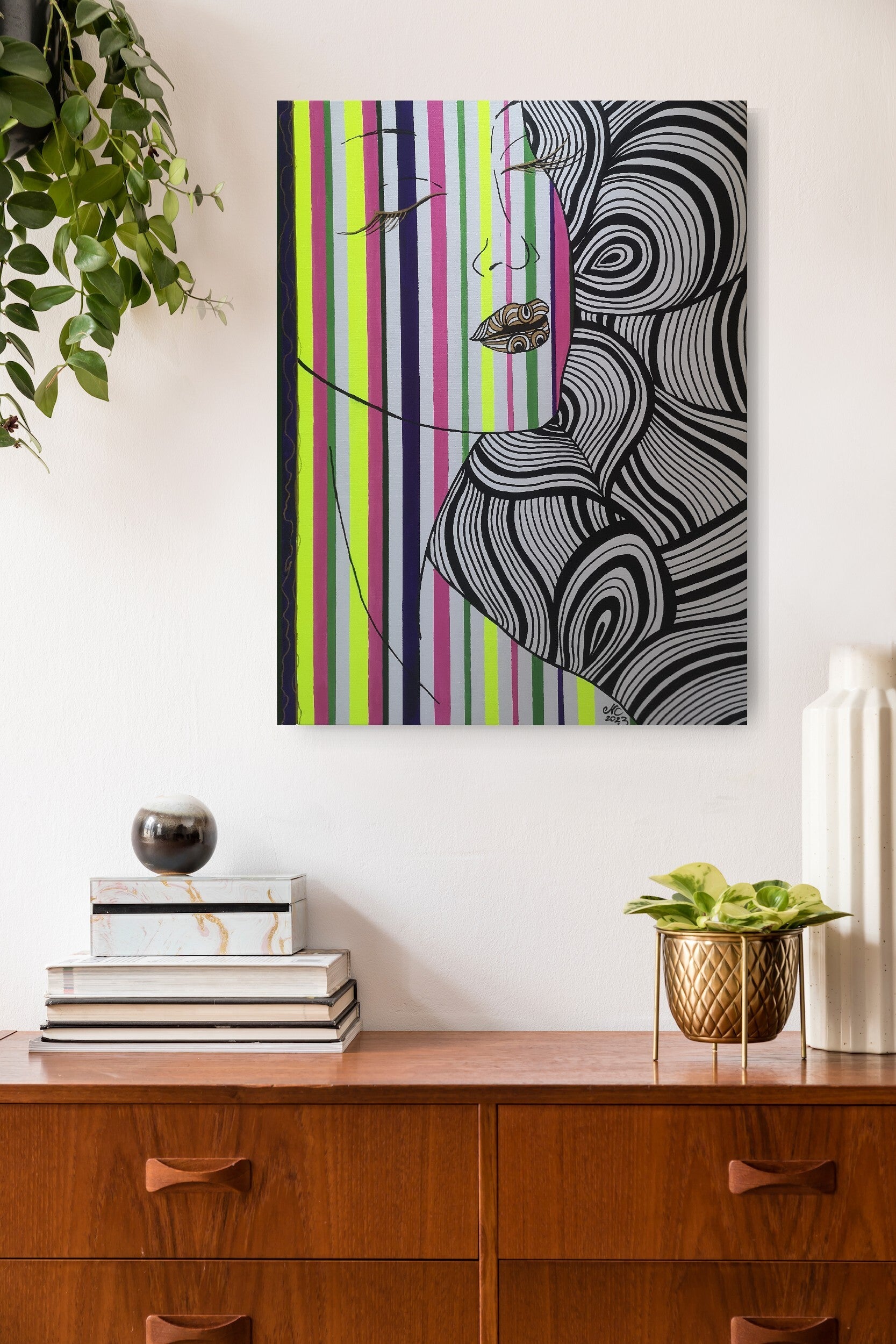 In this composition, a sketch-like depiction of a woman wrapped in vibrant, vertical stripes plays a visual symphony of colors and shapes. Her face, a study in tranquility and reflection, with eyes closed and full lips, portrays inner stillness and introspection. The colors surrounding her, a palette boldly spanning the spectrum, form a striking contrast to the background held in a black-and-white retro pattern. This pattern not only adds optical depth but also evokes a nostalgic mood, enhancing the timeless elegance of the portrayal.