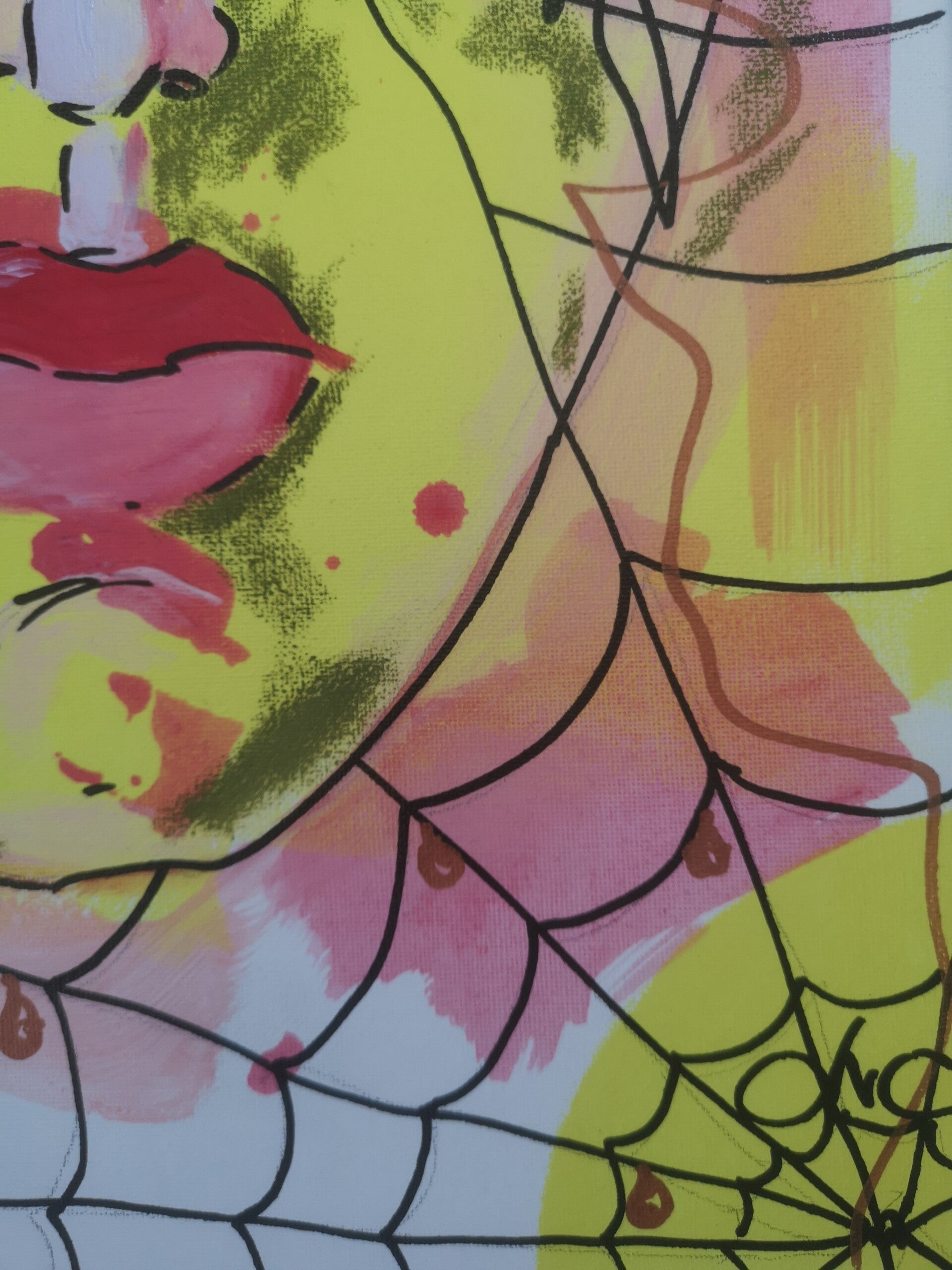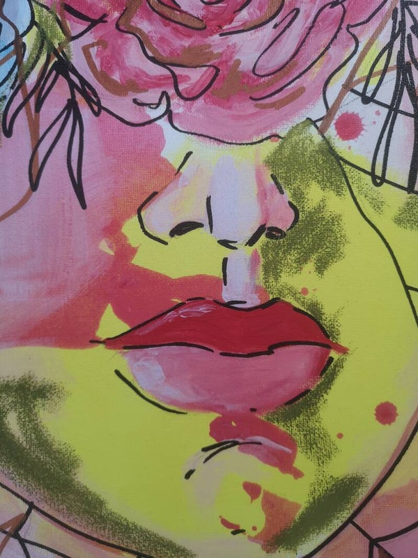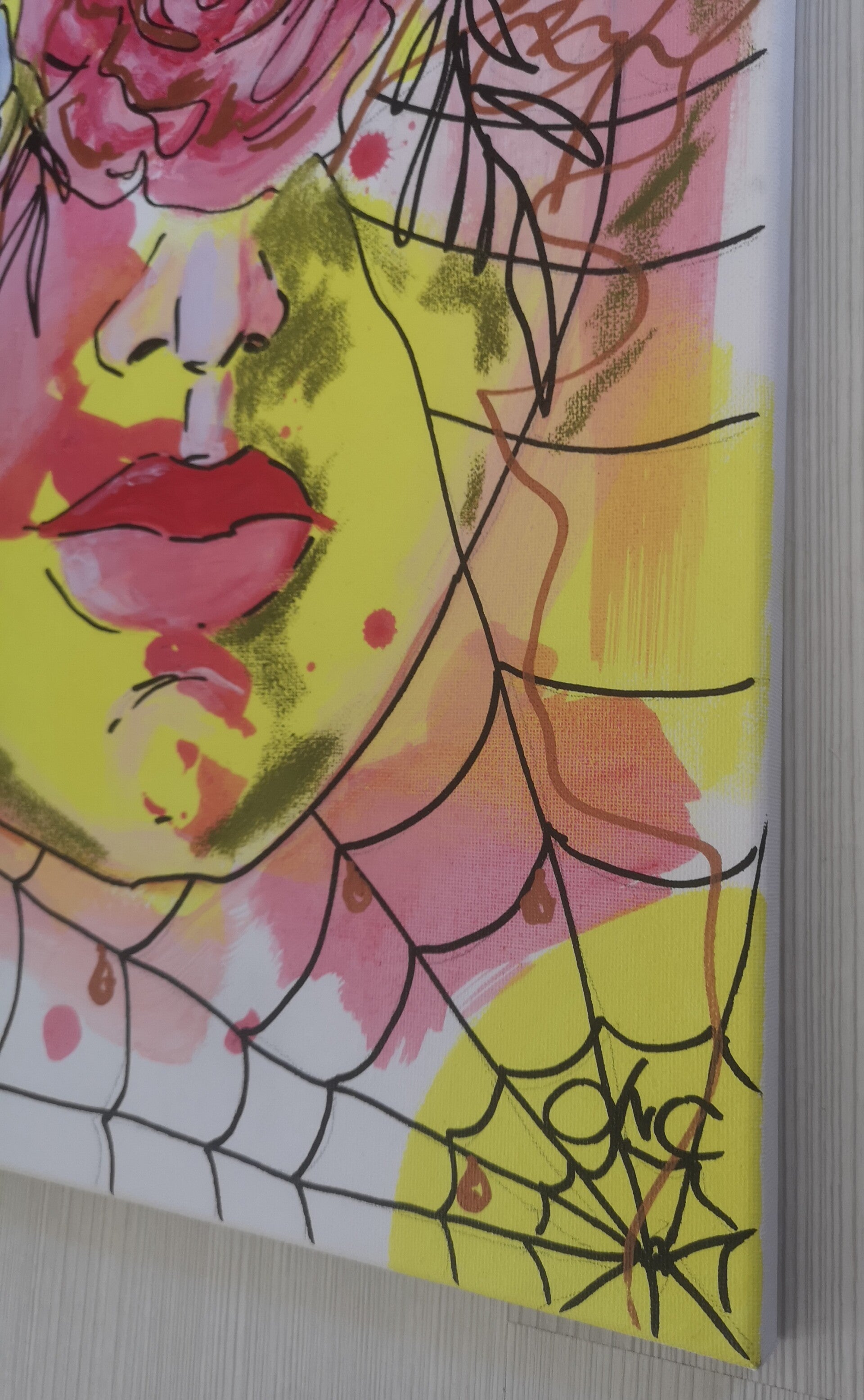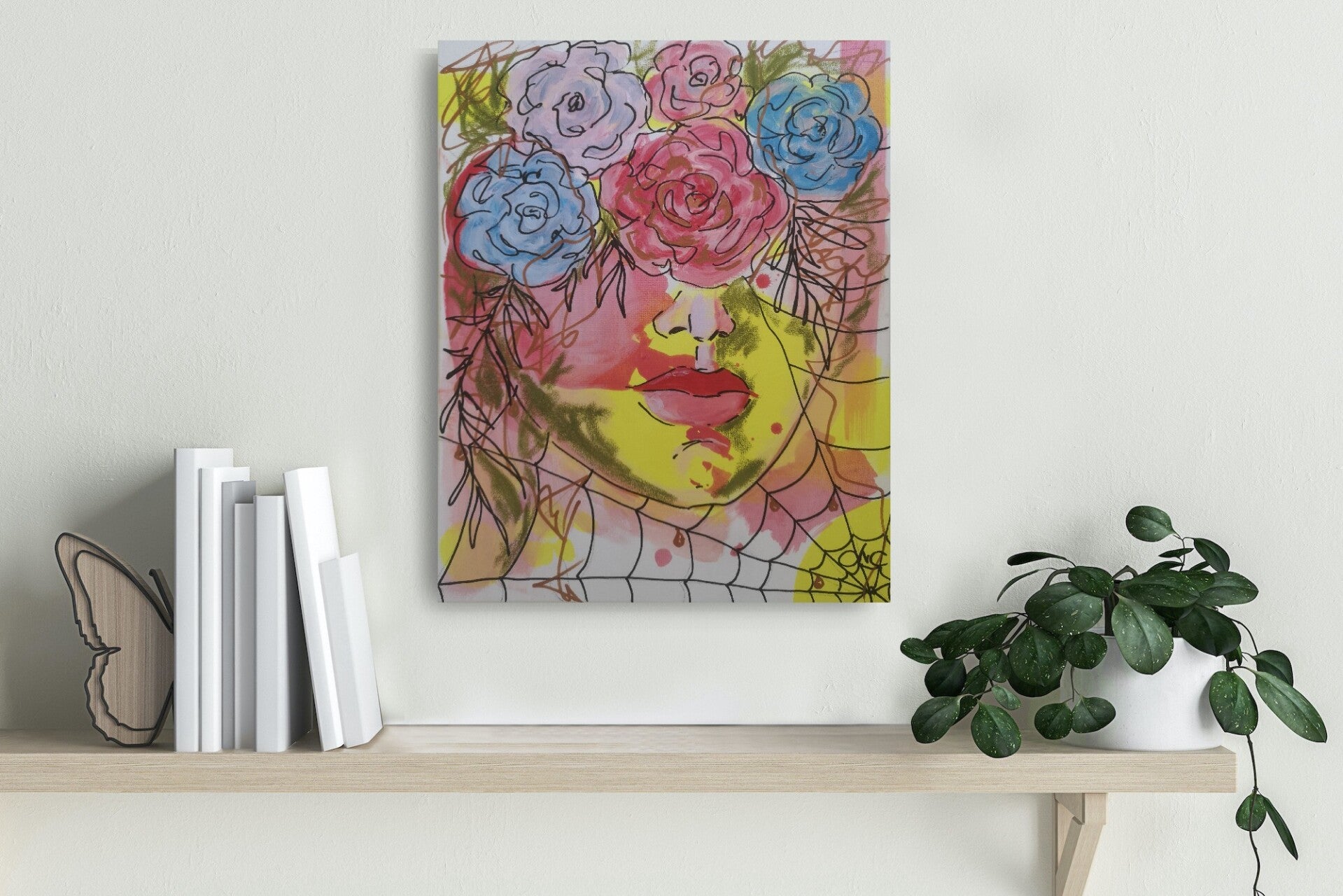 This canvas presents an acrylic portrayal of a woman's face, highlighted by full lips amidst a cascade of flowers and floral elements, intertwined with delicate spiderwebs. Sketch-like in parts, it uses a palette of soft pink, bright yellow, sky blue, deep red, and khaki green, creating a dreamlike quality. This artwork beautifully intertwines human features with nature's splendor, emphasizing the fragility and complexity of life's interconnectedness. It serves as a reminder of the beauty in diversity and the intricate relationships we share with the natural world, celebrating the aesthetic grace and the delicate bond between humanity and nature.