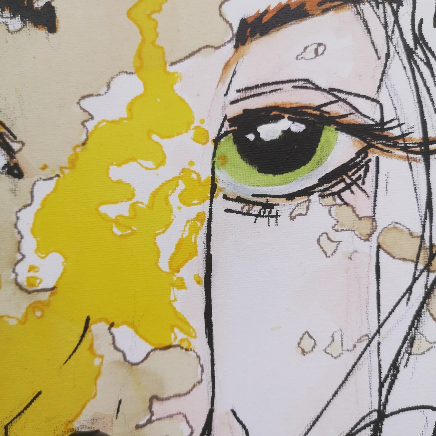 In this artwork, acrylic and wool on canvas merge into a captivating depiction of resilience and beauty. A woman's face, outlined only with black acrylic paint, gazes into the world through large, green eyes, while the background, immersed in yellow watercolor and coffee tones, creates a warm, inviting atmosphere. The deliberately placed tear in the canvas, roughly stitched with wool, along with the stitches around an eye, symbolize healing and toughness. They tell of the ability to repair oneself and draw strength from fissures. This piece is a tribute to the power of the human spirit to rise above injuries and shine through breaks.