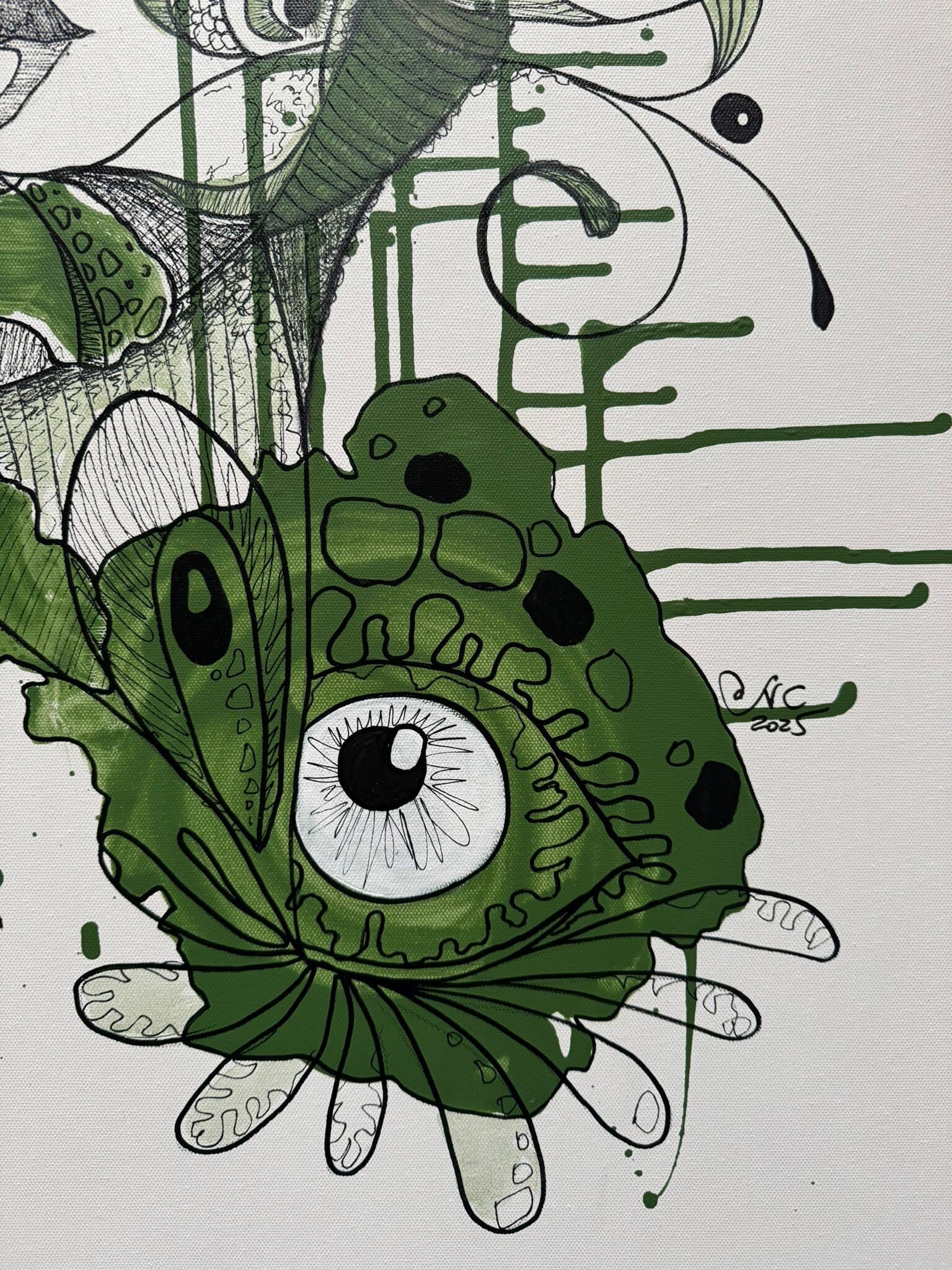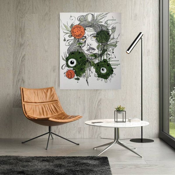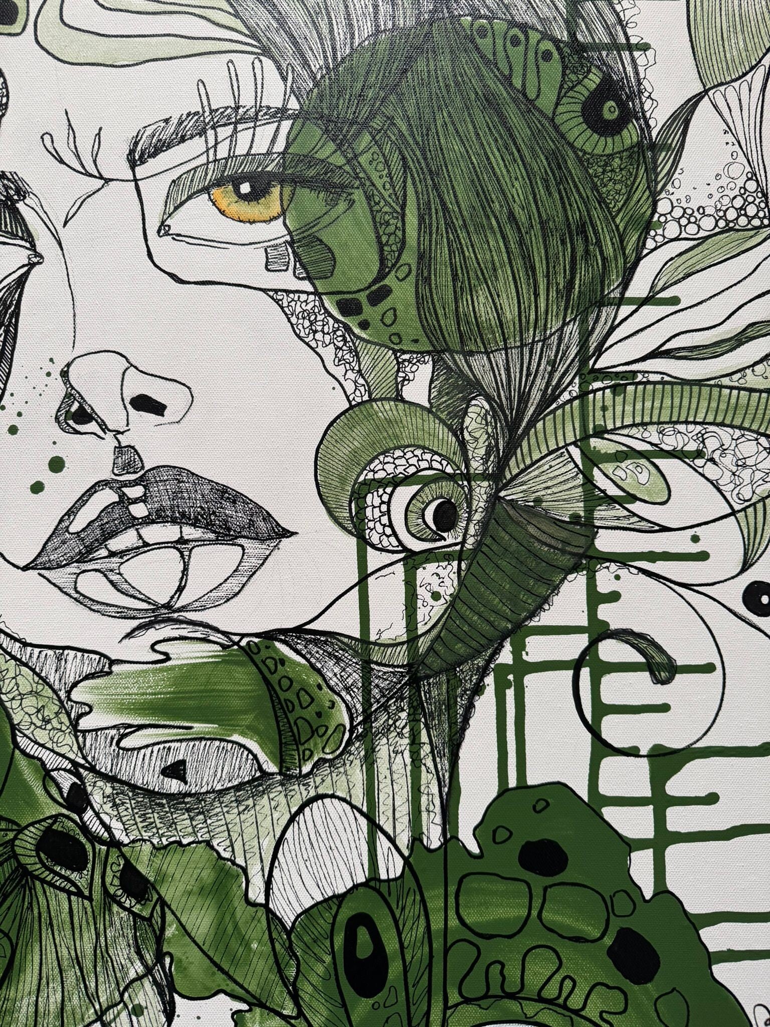 Every section of this canvas is a deliberate fusion of color and form, from the soft contours of the face to the stark, bold linework that defines the abstract and naturalistic shapes. The choice of a primarily monochrome palette with bursts of green and orange highlights the themes of life and perception, drawing the viewer into a contemplative narrative on the interconnectedness of all things.