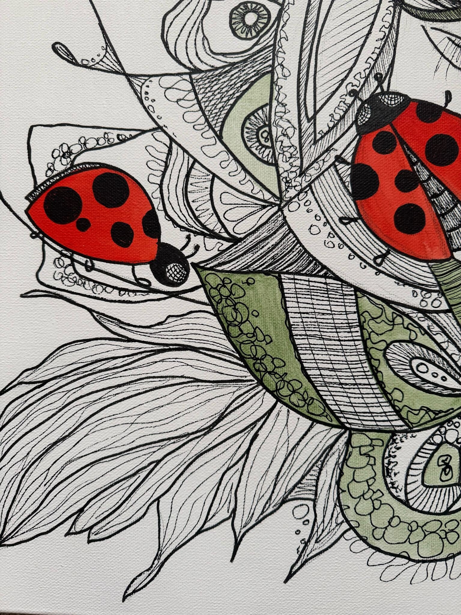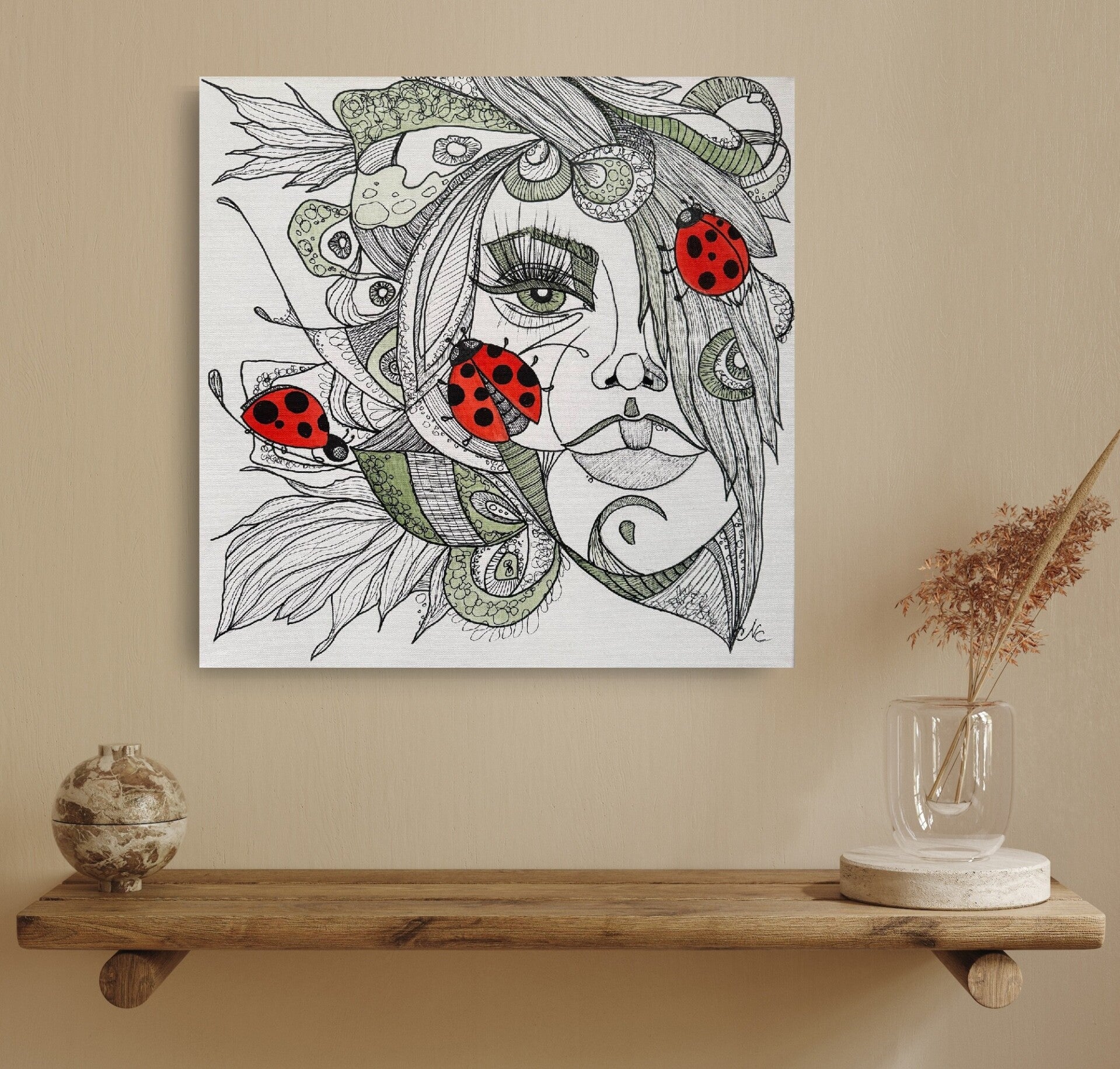 The central motifs of the painting, vivid red ladybugs, stand out starkly against the monochrome face and delicate green plant details. Ladybugs are often seen as harbingers of good luck, and their presence on the woman's cheeks and around her eyes symbolizes protection and prosperity. The fine, detailed lines and subtle coloration create an atmosphere of calm and contemplation, inviting the viewer to discover the small joys and fortunes hidden in nature.