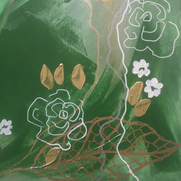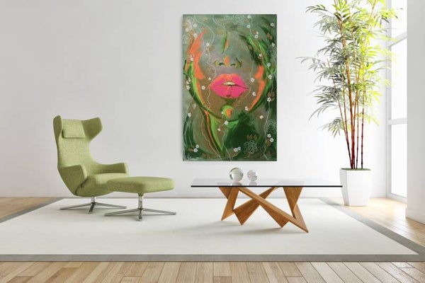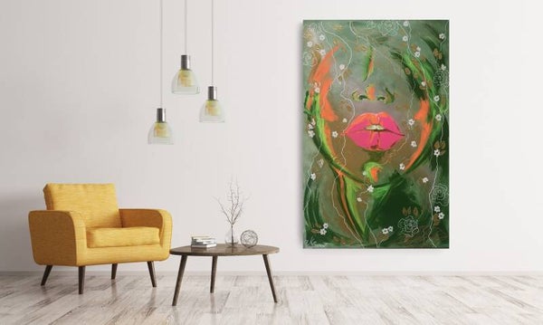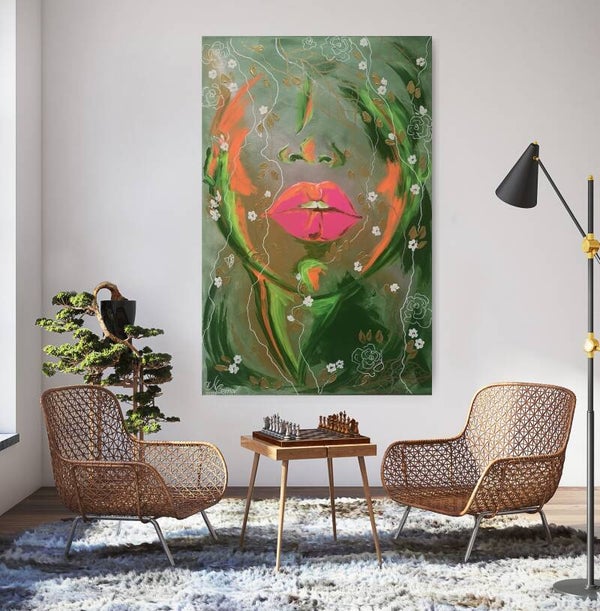 woman, face, pink lips, flowers, floral elements, gold, neon orange, neon green, silver, pine green, emerald green, pink, white, golden leaves
