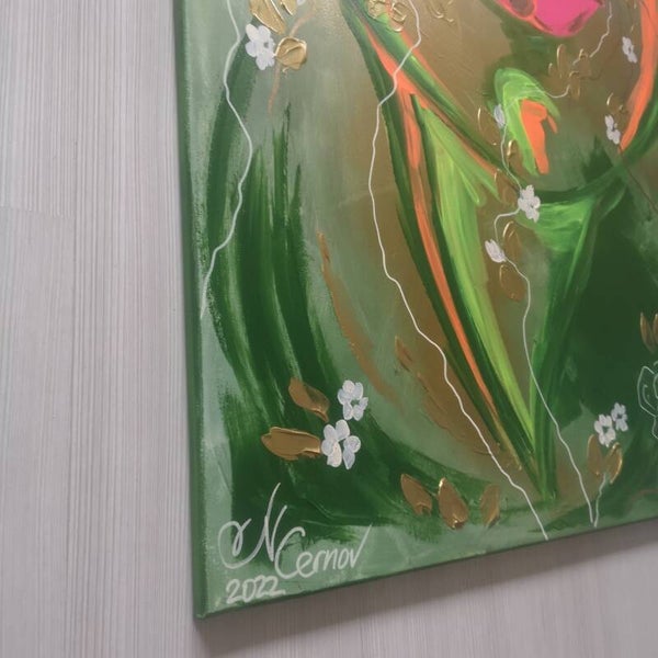 The painting is signed on the front and back and is ready to hang. The sides of the wall are painted. Canvas stretched on wooden strips. The picture can be hung frameless on the wall. The painting is protected with a varnish coating.