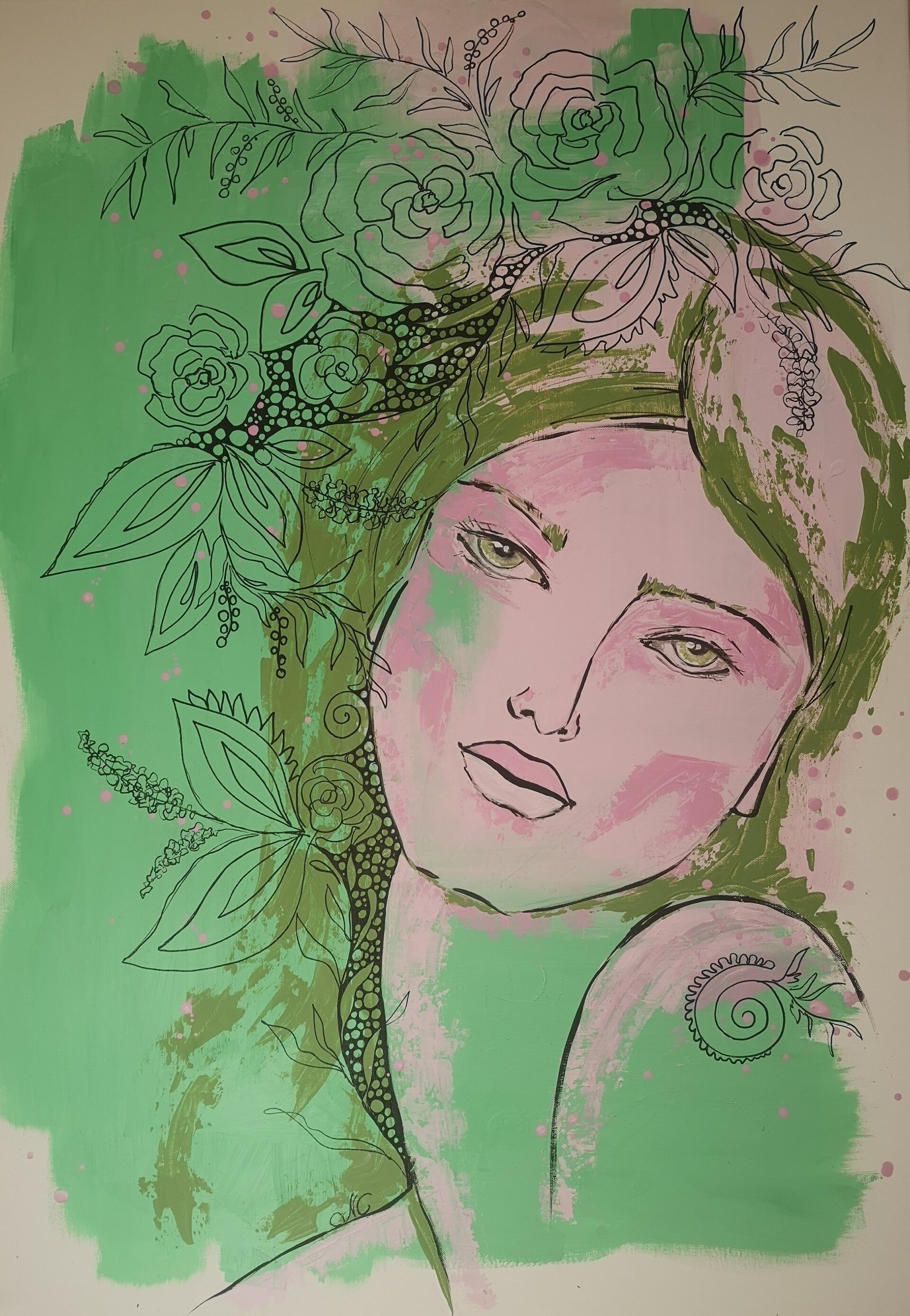**Emotional Harmony: The face of the spring girl, surrounded by light green tones and abstract patterns, creates an atmosphere of calmness and harmony in any space.