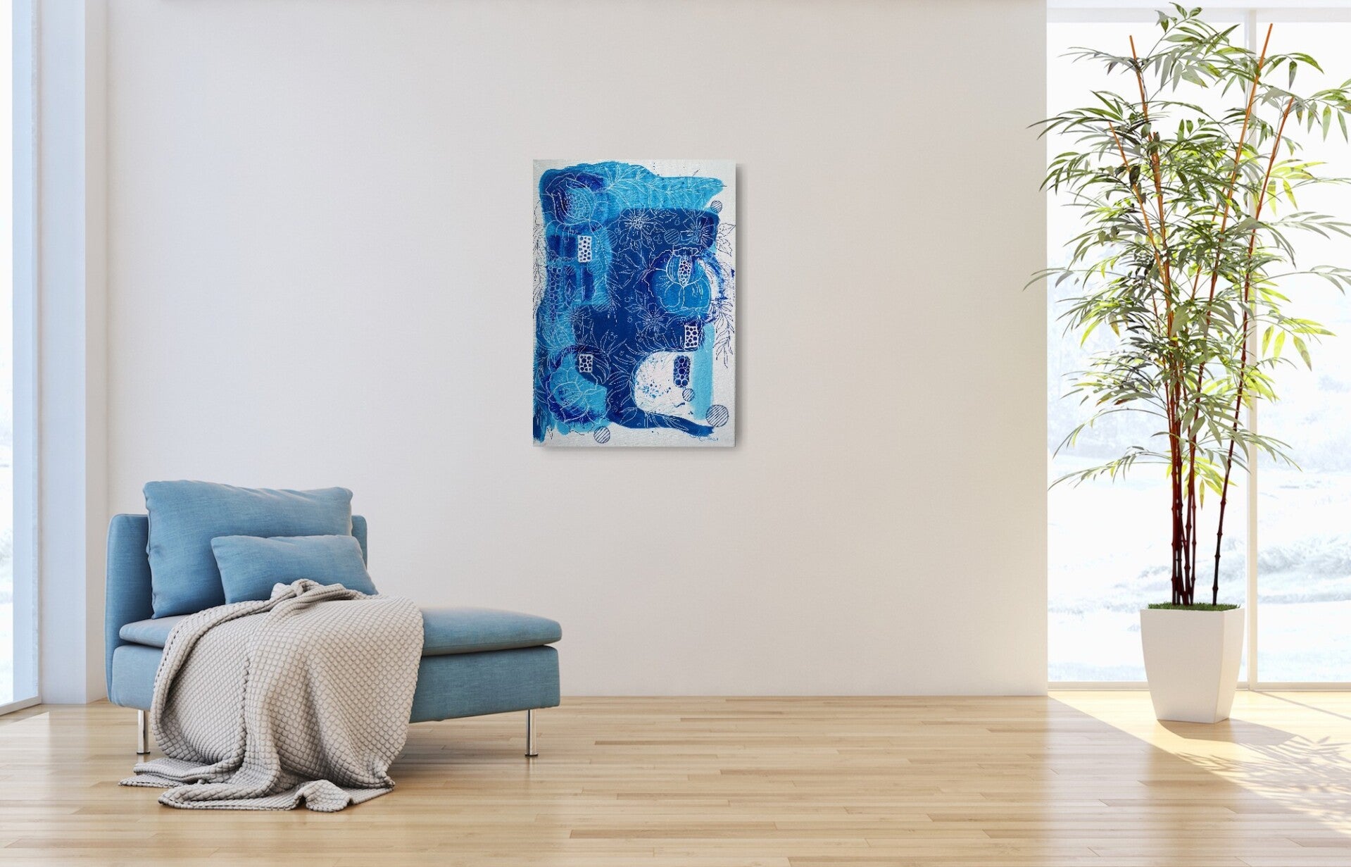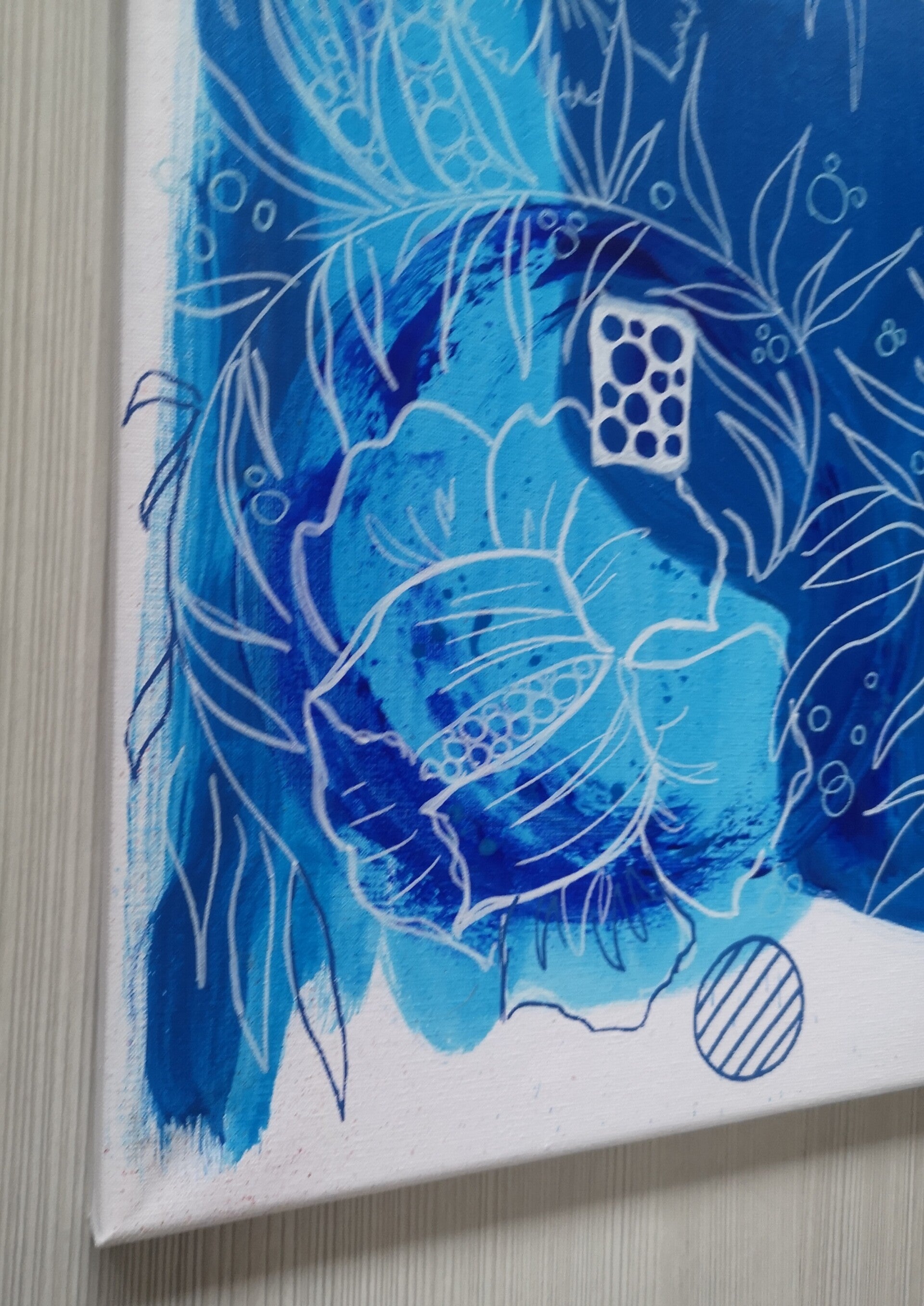 In this sensitive artwork, meticulously executed in acrylic on canvas, a wintry dream landscape unfolds in delicate shades of light blue to blue. The background, a soft spectrum of frosty blues, creates the perfect canvas for the motifs sketched upon it. With white, light blue, and blue acrylic pens, flowers, floral elements, circles, and various figures are artfully and sketchily applied as if they were swept onto the canvas by the cold breath of winter itself.